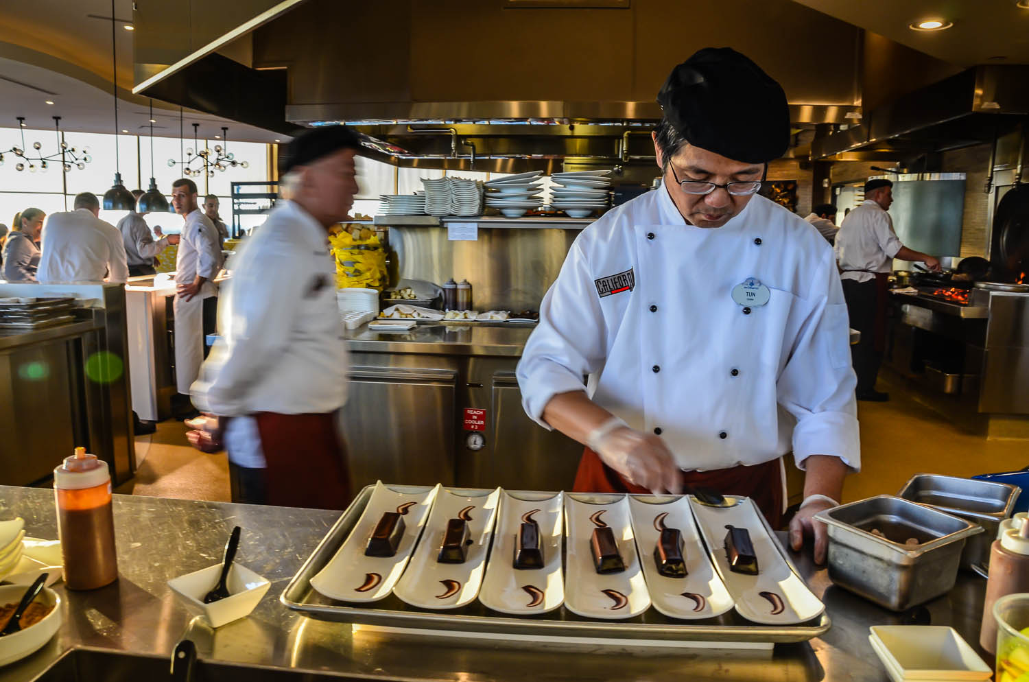 When I could tear my eyes from the view, I noticed the shiny new show kitchen at the center. We passed a number of food prep stations, including an intriguing sushi counter offering an Omakase tasting menu, but my eyes were immediately drawn to the desserts. One of the chefs was prepping a row of plates bearing Chocolate Pudding Cake, which looked almost too rich and pretty to eat. (See video for the recipe.)