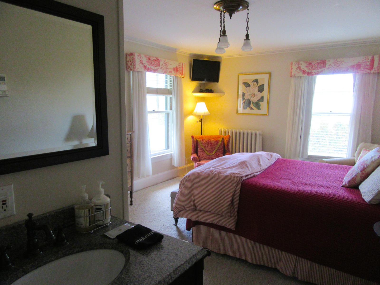 Since this inn wasn’t built with a bathroom in each room, some (like mine) feature a toilet and shower in a closet-sized space, while the granite sink is near the bed.