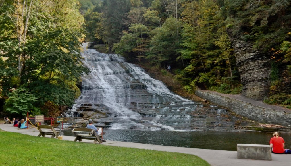 What you see from the base of this sun-splashed cascade – Buttermilk Falls – that tumbles, like a fancy Victorian wedding dress, over tiered slabs of limestone, is dramatic of course. But climb the mile-long Gorge Trail and its overlooks for bigger thrills, and misty chills.