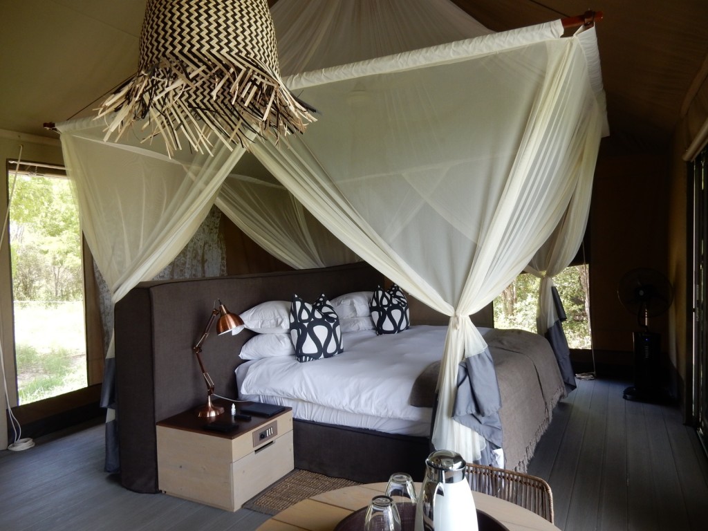 Rain showers afford wildlife viewing – as exterior walls are windows. There are shelves for clothing, cushy chairs, a table, fans, and an extravagant king-sized high-thread-count sheeted bed, encased in mosquito netting at turn-down. The bathroom is en-suite. The whole space is larger than many city apartments.