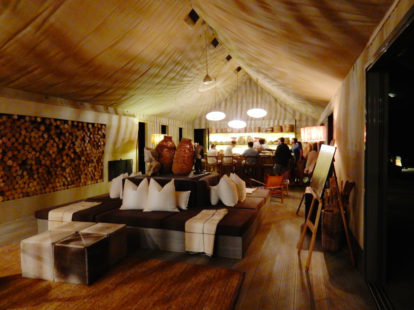 The “living room/bar” enclosure is an aesthetically pleasing assemblage of local arts and crafts and eye-catching furniture that would look at home in a chic NYC hotel lobby. There’s a separate library tent and an enclosed dining structure in case it rains.