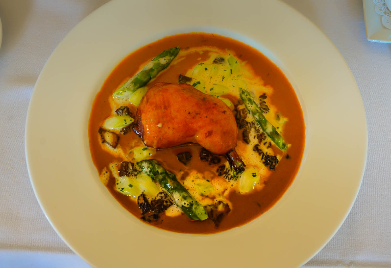Chicken legs stuffed with morels, Mercière sauce, green asparagus, rice pilaf
