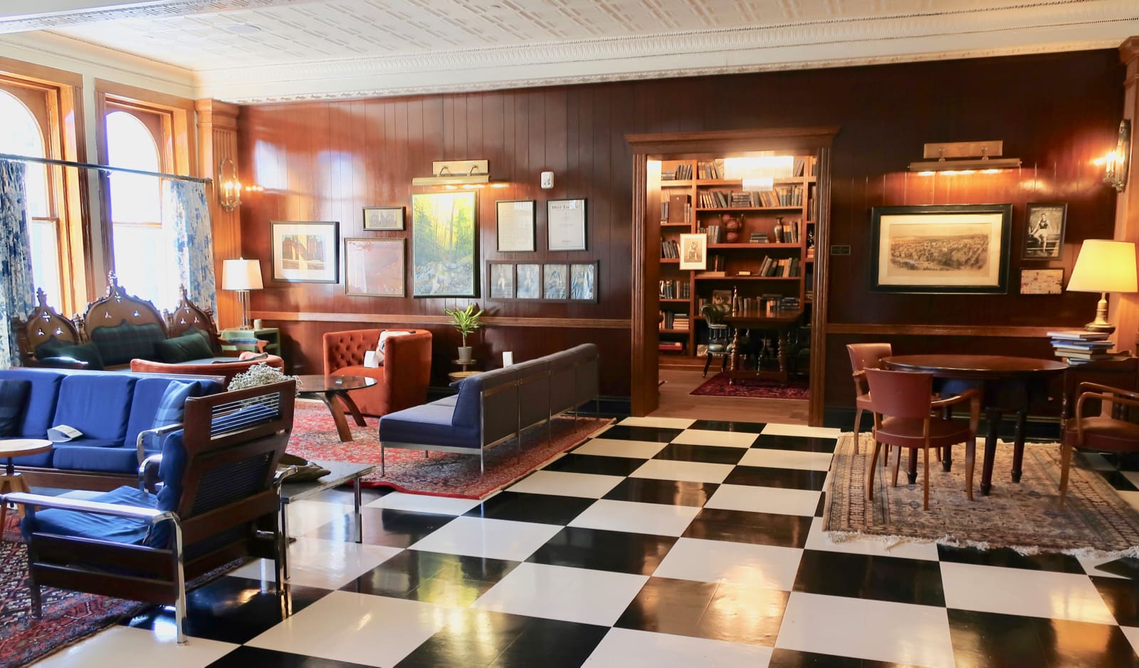 The vast lobby of the hot New Haven boutique hotel, The Blake, with its clusters of seating and work surfaces, is perfect for groups of friends, family, and colleagues who wish to gather in more intimate spaces.