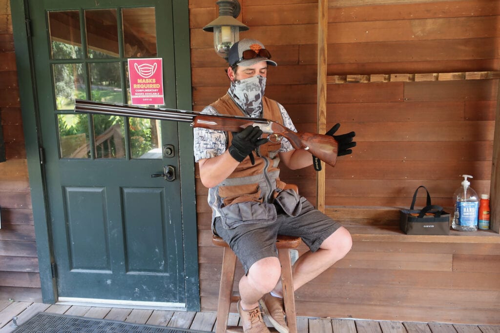 Safety at Orvis is key. Before I even held the shotgun, my instructor, Andy McDermott, made sure I knew how to open and “break it” with barrel pointing “forward and down,” and how to always carry it that way. Plus, there are no “bullets” in the world of sporting clays or bird hunting. Just shells and pellets (110 tiny pellets per shell for my purposes).