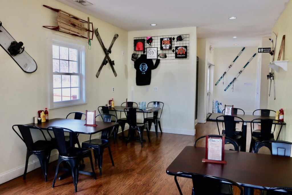 The Burn Barrel – a small, casual cafe – sits rather arbitrarily at the base of a mountain. Half the fun is traveling the twisty-turny steep roads to get there. Less than two miles from Bryce Ski Resort, it’s walls are festooned with skis and snowshoes, etc. There’s a bar downstairs, but if you’re here during the day, Burn Barrel’s burgers, franks, and other pub food is good eatin’ – and will certainly fuel you for a day on the slopes or trails.