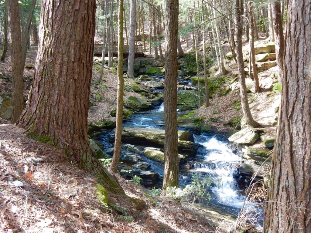 To do it justice and get your forest bathing in, plan 45 minutes to an hour. While marked “easy” – this is not a flat paved path. There’s a 121 ft elevation, peppered with roots and rocks. But……white water tumbling over boulders and fallen trees in the cataract of a forest floor is as “gorges” as it gets.