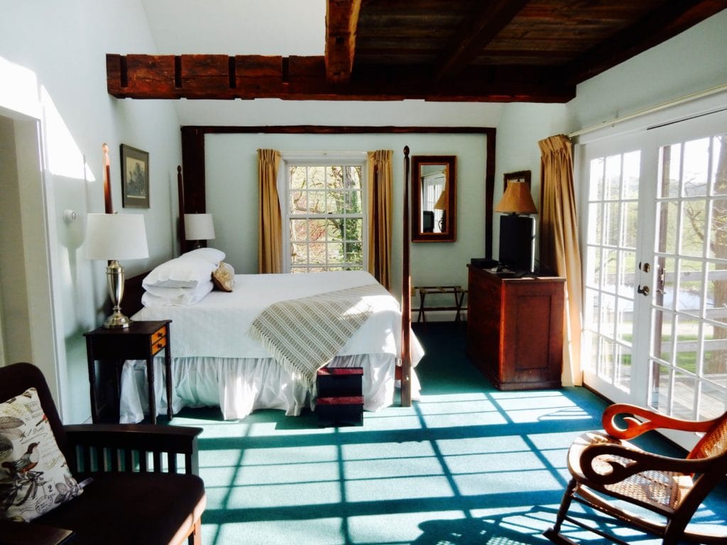 Walk into a great room straight out of a New England guidebook. High cathedral ceiling, soaring brick wall with fireplace-turned-wood stove, floral wallpaper, wing-back chairs. It’s a kind of John-Adams-lives-here look. And the welcome could not be kinder or more down to earth – which is the secret to this place. This genuinely warm greeting by people who are inherently nice sets the tone for the guest experience to come.