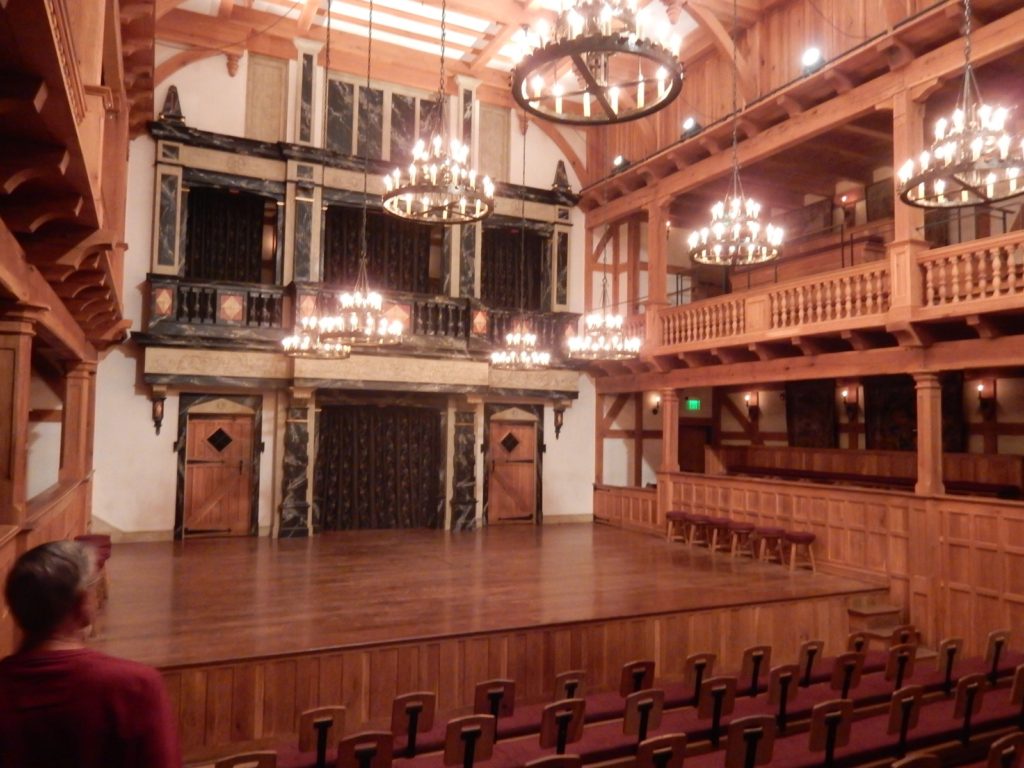 The tour continues into the Elizabethan theater, and then onto the boards, where we’re informed of Shakespeare’s “staging conditions.” Some, but not all of these, are followed today.