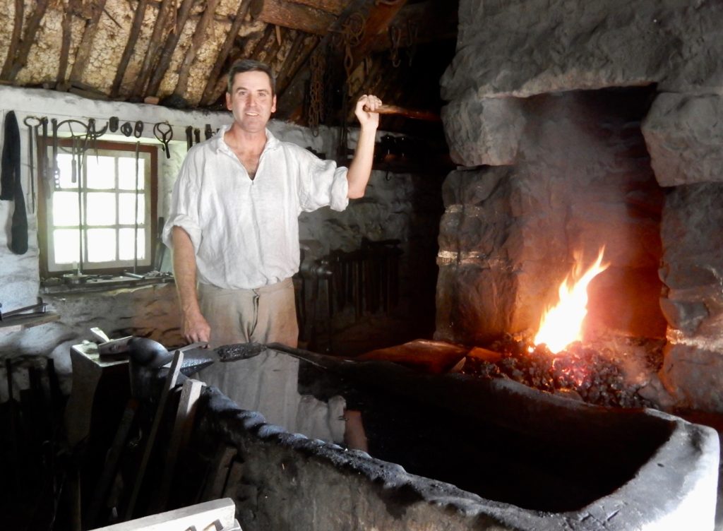 Watch the linen-clad blacksmith hammer out hardware for buildings, and kitchen tools in the working 1700’s Irish Forge.