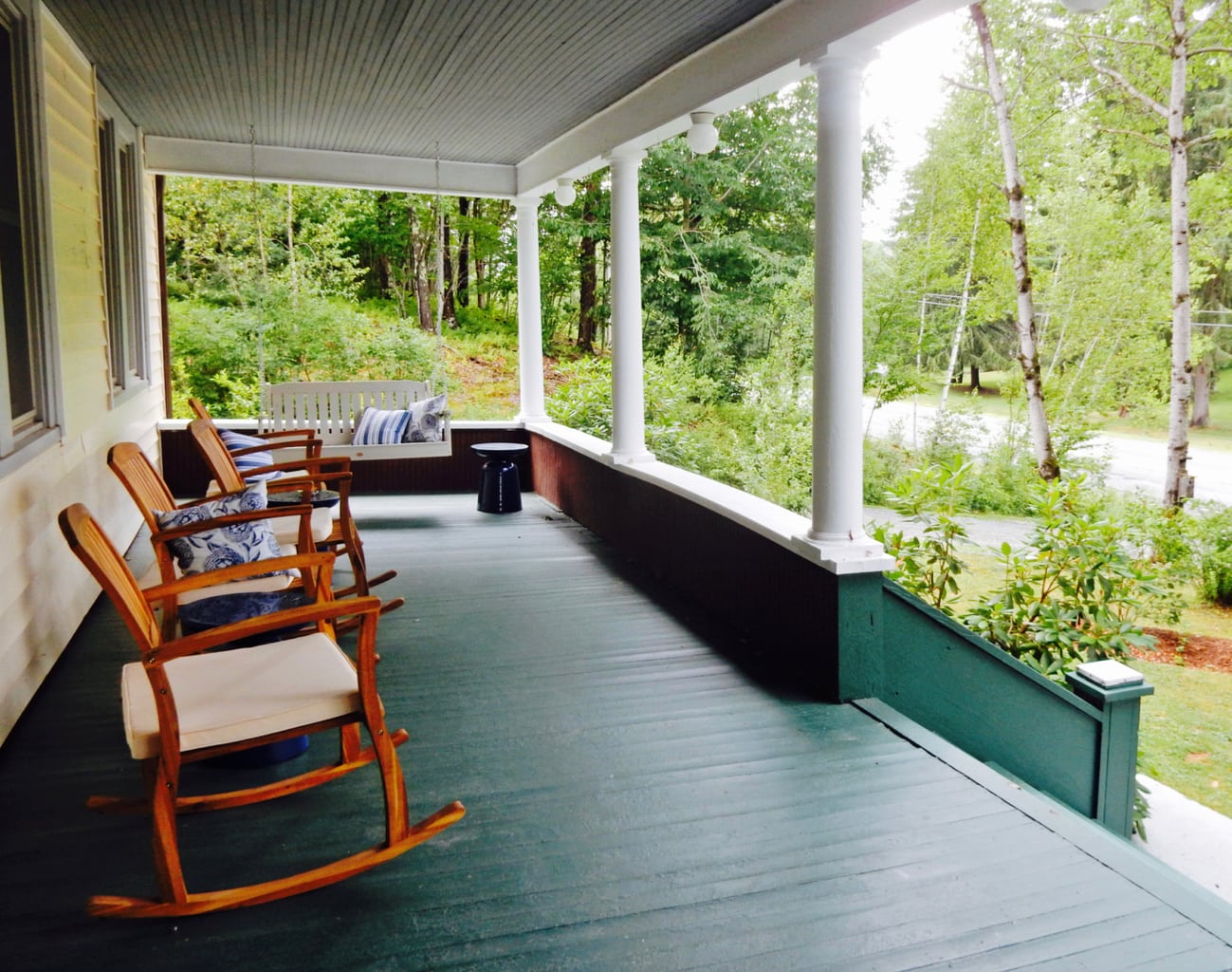 Walk up to the inviting porch, with requisite quasi-Adirondack-style rocking chairs and into the main “living room” – reminiscent of a Catskill summer camp gathering area, if your camp’s great room had been peppered with Knoll and Herman Miller furniture.